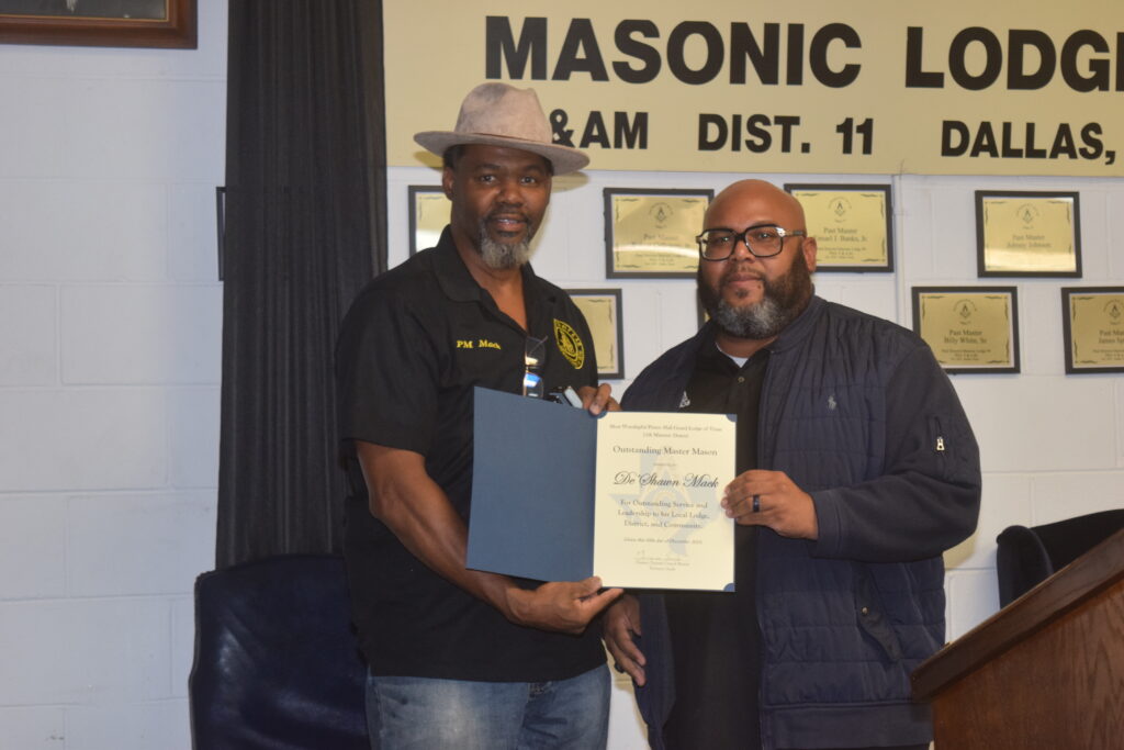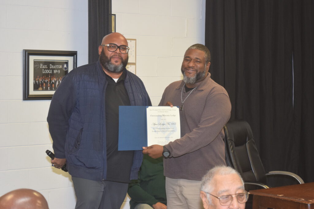 • Outstanding Master Mason – De Shawn Mack, who, among other things, has made himself and their lodge hall available for bringing loads of food that the District has received at periodic intervals and allow coordination to break out the loads for distribution to recreation centers, schools, churches, etc..