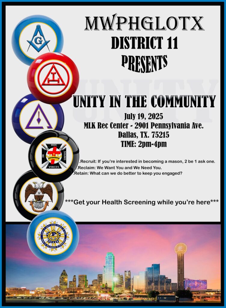 On Saturday, July 19, 2025, Masonic District #11 for the Most Worshipful Prince Hall Grand of Texas and Its Jurisdiction hosted a Unity In The Community event at the Larry Johnson Recreation Center (3700 Dixon Avenue; Dallas, TX 75210 ).