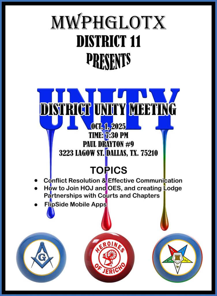 On Wednesday, October 1, 2025, District #11 of the Most Worshipful Prince Hall Grand Lodge of Texas held its next iteration of its District #11 Unity Meeting, which includes the Master Masons, Heroines of Jericho and Order of Eastern Stars.