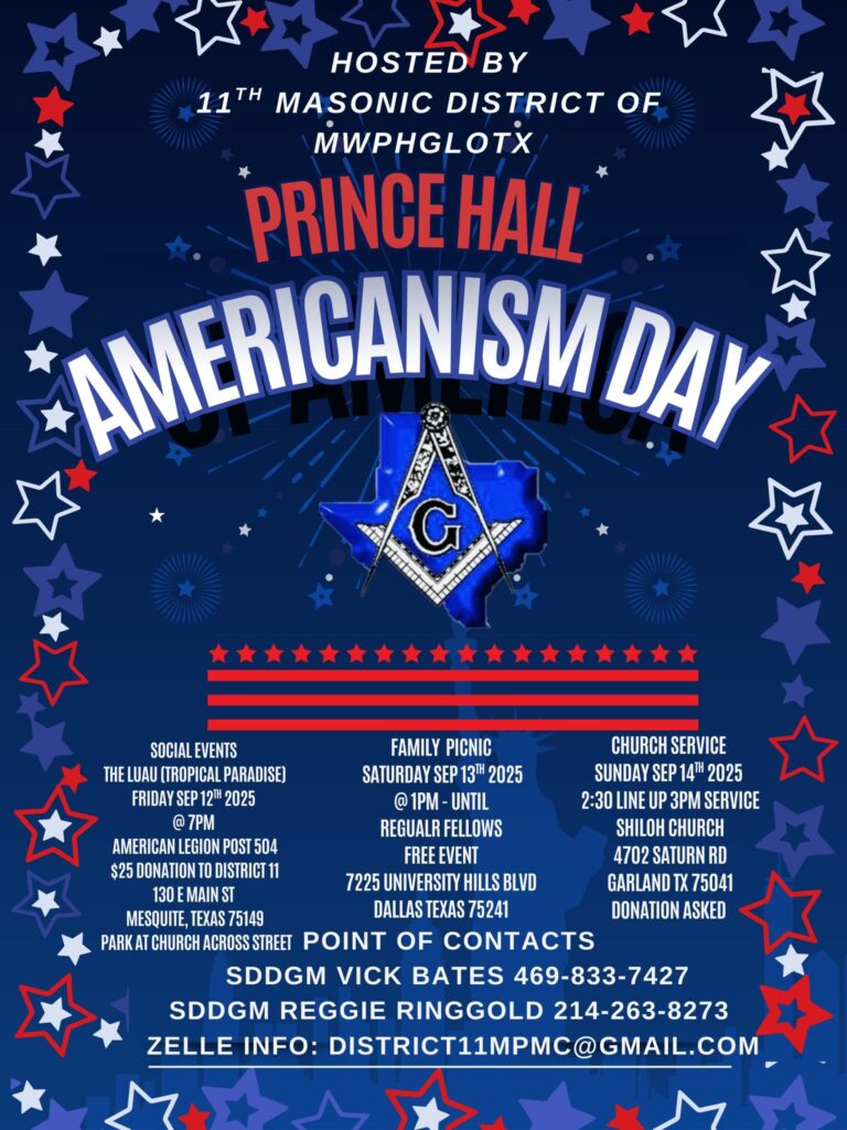 The 11th Masonic District of the Most Worshipful Prince Hall Grand Lodge of Texas finished Prince Hall Weekend with the Annual Prince Hall Americanism Day Service on Sunday, September 14, 2025 at the Shiloh Church ( 4702 Saturn Road; Garland, TX 75041 ).